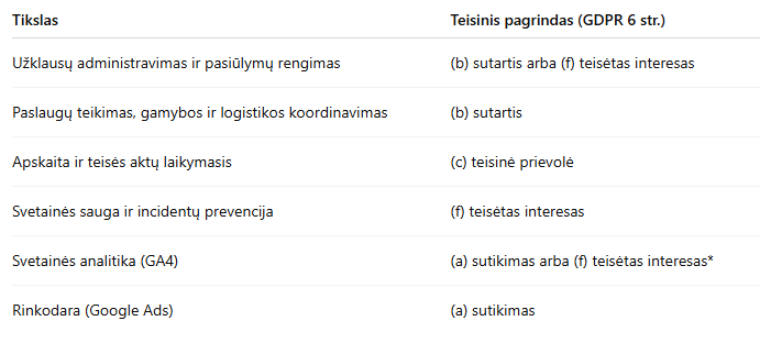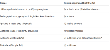 4. Duomenų tvarkymo tikslai ir teisiniai pagrindai