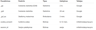 IP adresas, naršyklės tipas, įrenginys, slapukų ID, sutikimų įrašai.